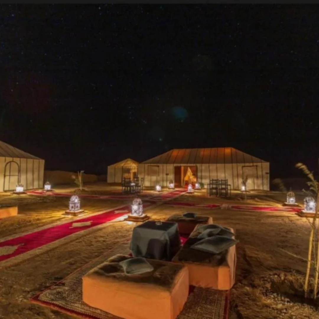 Each equipped with comfortable beds, linens, and amenities. You’ll have your own space to relax, unwind, and enjoy the desert tranquility.The tents are spacious and decorated with traditional Moroccan touches, giving you a unique and cozy atmosphere. You’ll have access to shared facilities including a dining area, sandboarding in the dunes, Berber music all within the camp.
