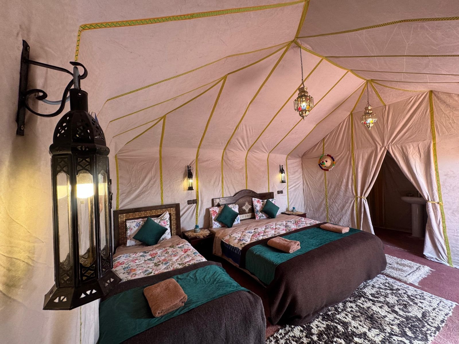 Each equipped with comfortable beds, linens, and amenities. You’ll have your own space to relax, unwind, and enjoy the desert tranquility.The tents are spacious and decorated with traditional Moroccan touches, giving you a unique and cozy atmosphere. You’ll have access to shared facilities including a dining area, sandboarding in the dunes, Berber music all within the camp.