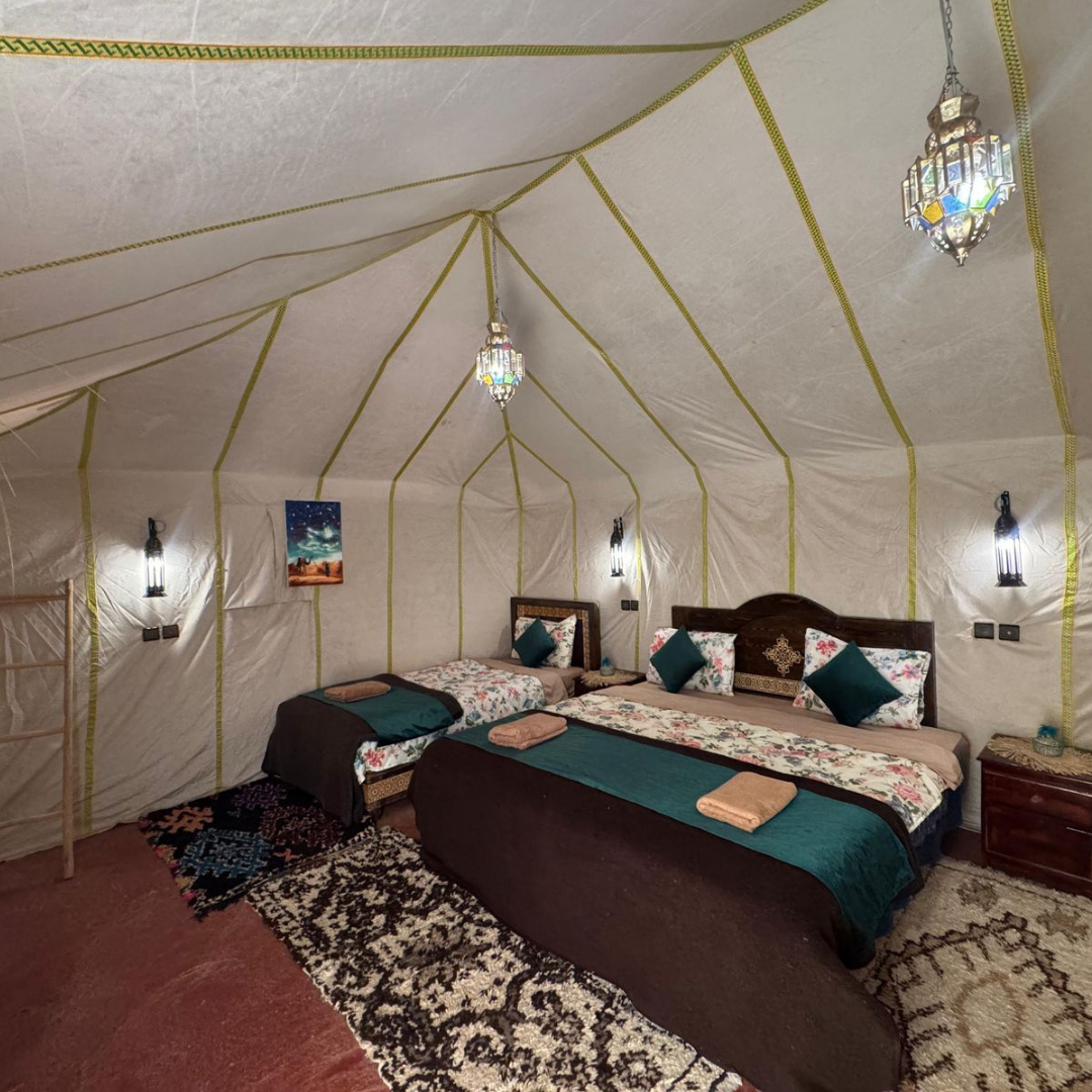 Each equipped with comfortable beds, linens, and amenities. You’ll have your own space to relax, unwind, and enjoy the desert tranquility.The tents are spacious and decorated with traditional Moroccan touches, giving you a unique and cozy atmosphere. You’ll have access to shared facilities including a dining area, sandboarding in the dunes, Berber music all within the camp.